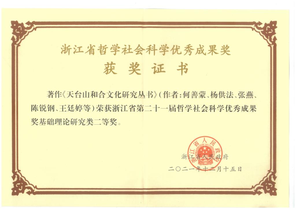近日,浙江省人民政府颁发《浙江省人民政府关于表彰浙江省第二十一届哲学社会科学优秀成果奖的决定》(浙政发〔2021〕40号),我院何善蒙、杨供法、张燕、陈锐钢、郝金广等老师编写的《天台山和合文化研究丛书》获“基础理论研究优秀成果奖”二等奖。该套书是浙江省文化研究工程重大项目的学术研究成果,系统梳理了和合文化的历史发展脉络、当代价值以及对外传播情况。作者:何善蒙教授杨供法副教授张燕副教授陈锐钢博士郝金广博