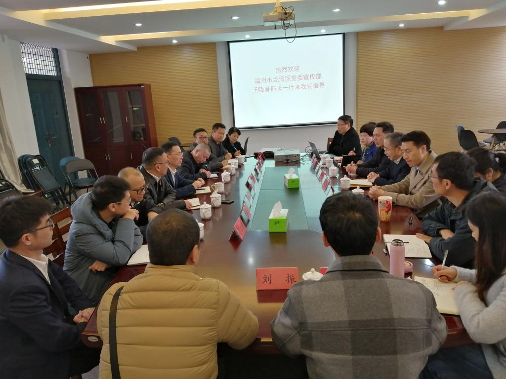3月5日下午,温州市龙湾区区委常委、宣传部长王晓春一行9人,在台州市社科联汤天伟副主席、汪小倩秘书长等陪同下,到和合文化研究院考察交流,我校副校长、和合文化研究院行政院长王正、执行院长李建军、副院长杨供法以及敖英博士等研究人员参与了交流座谈。