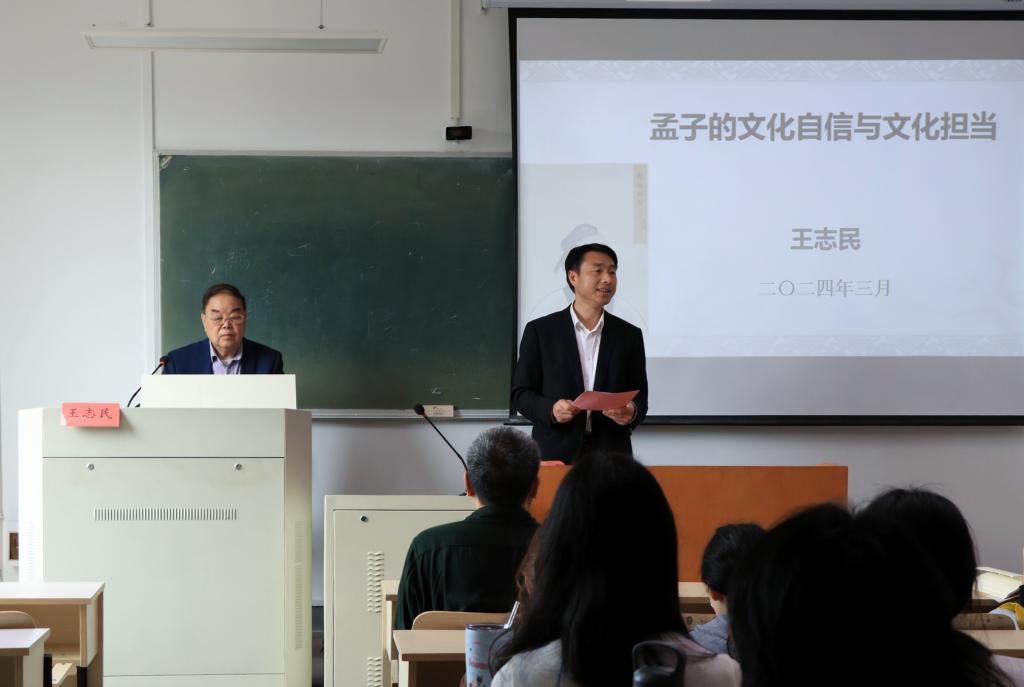 3月25日,山东师范大学原副校长、特聘资深教授、博导王志民在人文学院1305教室开展“孟子的文化自信与文化担当”讲座,副校长、党委委员李建军主持。