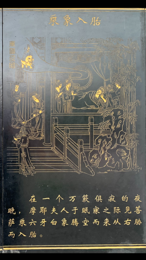 云冈石窟的建造者善以雕像讲述佛教故事,其中最多的是讲述佛祖从出生、出家、成道、弘法直到涅槃的各种事迹。此类故事被称为本行故事,或佛传故事。第6窟的中心塔柱和东壁、南壁就是集中讲述本行故事的,包括了乘象投胎、树下诞生、七步宣言、骑象入城、逾城出家等情节。其中乘象投胎是最具区别度的本行故事,在第37窟东壁表现得最为生动:佛祖母亲摩耶夫人侧卧于榻上,左上角为一头飞向右下角的大象,象背有一须弥座,座上有一菩萨怀抱具有舟形背光的小佛像。熟悉本行故事者一看便知其所绘内容。夫人榻下有四个女子各持琵琶、腰鼓、琴瑟等乐器,营造了佛祖降生的欢乐气氛。这让我想起了9日在五台山景区入口与黛螺顶旃檀殿墙壁上所见到的同一主题的雕刻。