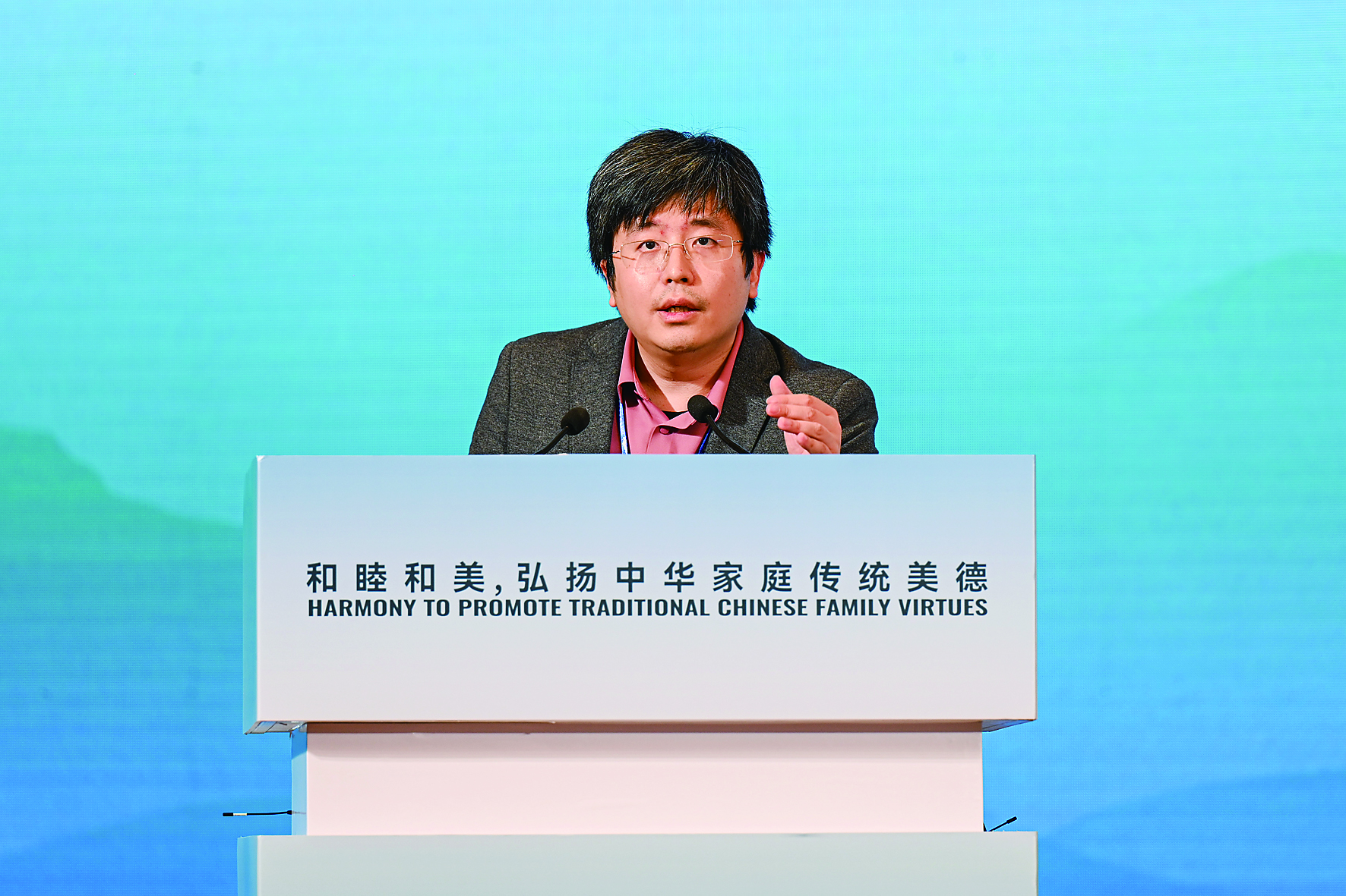 于建福,国际儒学联合会副会长、中国教育学会传统文化教育分会副理事长,现场分享了《尚中贵和 弘扬中华民族家庭美德》。