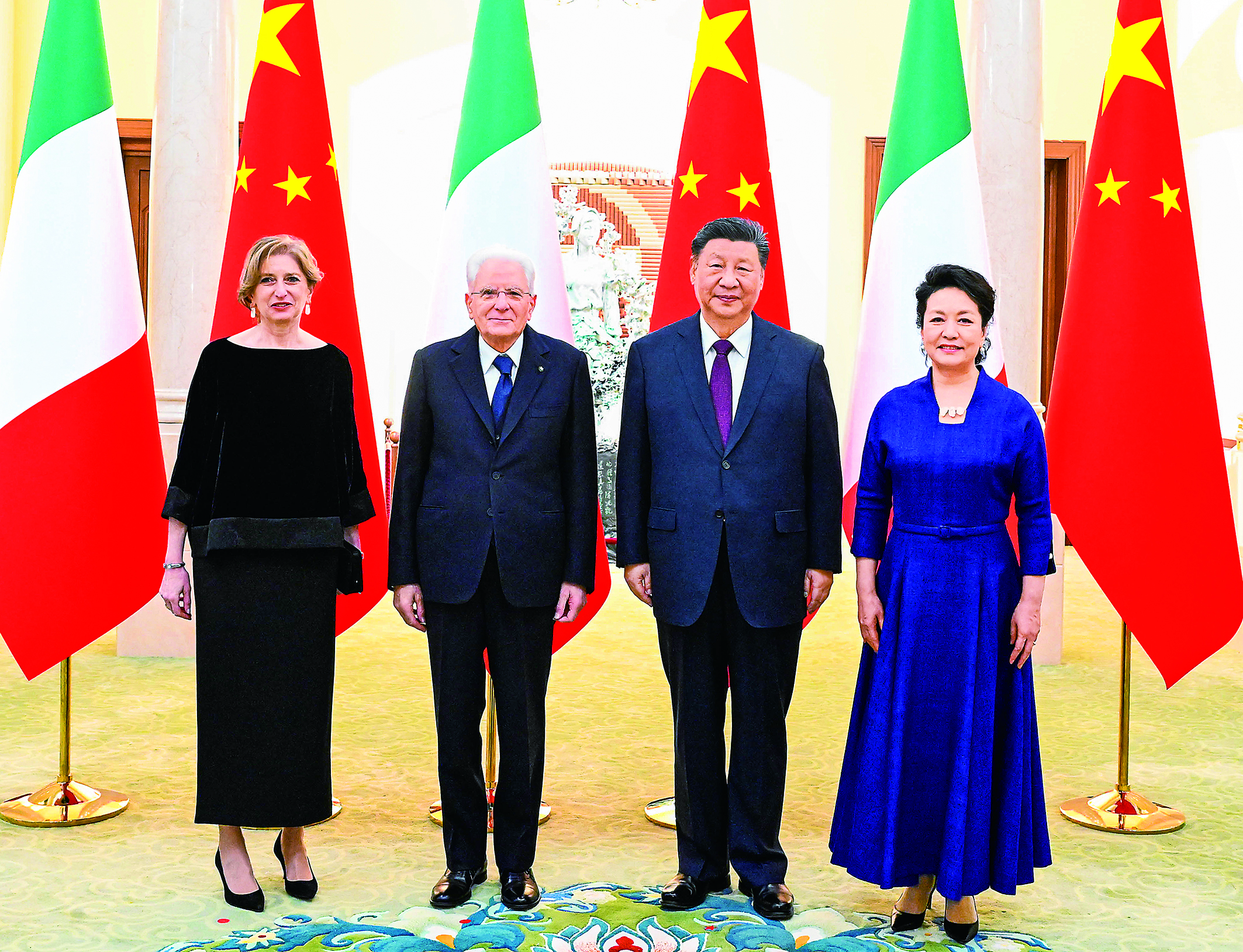 十一月八日下午,国家主席习近平在北京人民大会堂同来华进行国事访问的意大利总统马塔雷拉举行会谈。这是习近平和夫人彭丽媛同马塔雷拉和女儿劳拉合影。