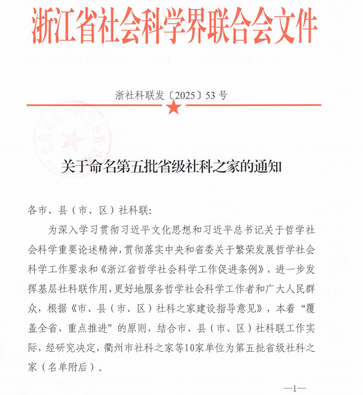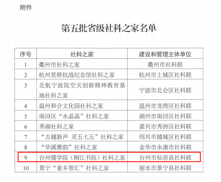 近日,浙江省社会科学界联合会发文公布了第五批省级社科之家的名单,台州儒学院(桐江书院)社科之家位列榜单,是本次台州申报中唯一入选的社科平台,为促进本市社科发展、推动社科普及、提升社科研究水平提供了更加有力的支撑。