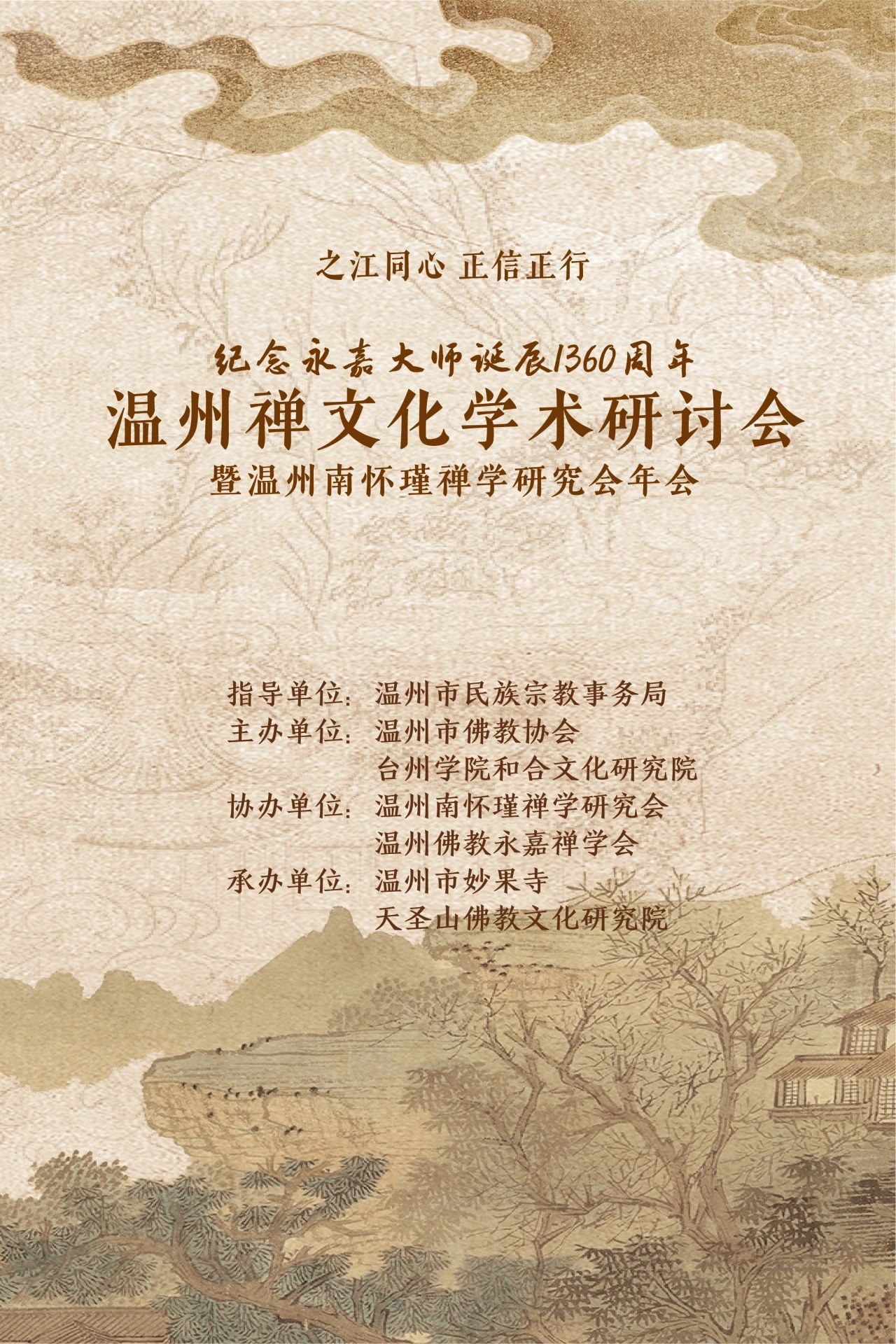 研讨会由温州市民族宗教事务局指导,温州市佛教协会、台州学院和合文化研究院联合主办,温州南怀瑾禅学研究会、温州佛教永嘉禅学会协办,温州市妙果寺、天圣山佛教文化研究院承办,中国人民大学佛教与宗教学理论研究所、北京大学佛教研究中心、上海师范大学佛教文献研究所为学术支持单位。来自政府机构、科研院所、全国高校的60余位领导和专家学者齐聚一堂,围绕永嘉大师生平事迹、典籍著作、温州禅文化以及佛教中国化等专题展开了深入研讨,为进一步推进佛教中国化和传统思想研究出谋划策、凝聚力量。
