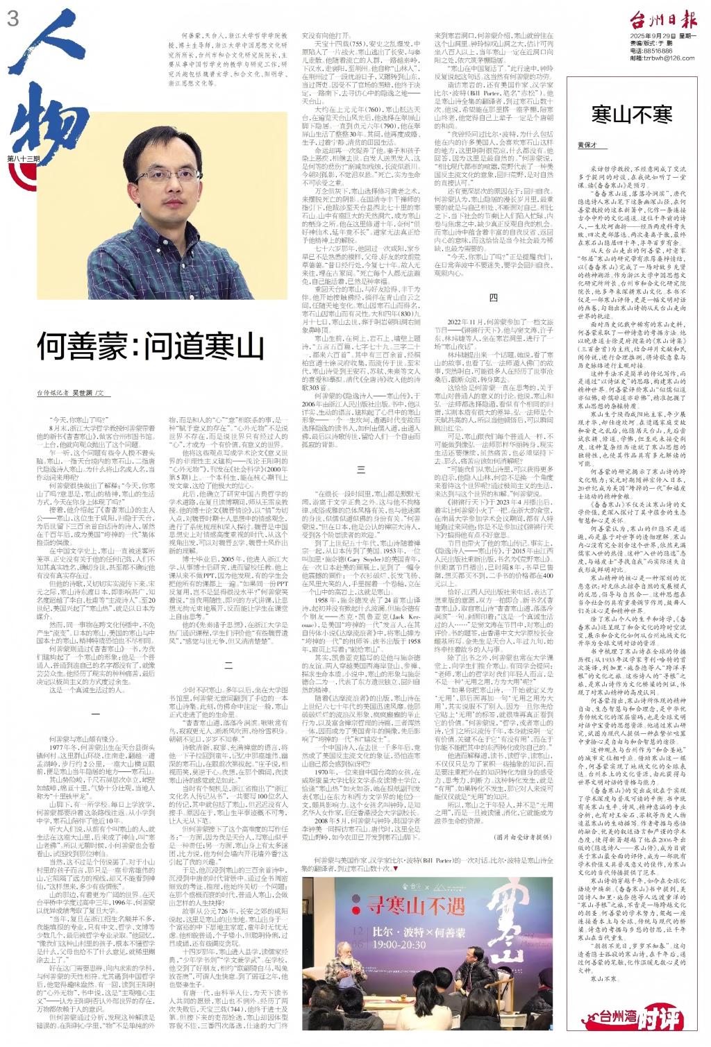 2025年9月29日,《台州日报》“人物”版面专题报道我院何善蒙教授及其新作《杳杳寒山》的创作心路。何善蒙教授作为天台本地人,与寒山有着天然的“缘分”,寒山、寒山诗或者寒山精神也浸润了何教授的精神世界,成为他专业报考、学术研究的重要指引。工作后的何教授,把对家乡的热爱转化为对寒山研究与和合文化研究的兴趣,他多次在全国高校、文化机构举办讲座,深入解读寒山诗的内涵与和合文化的精髓,让更多人了解这份文化遗产。同时,何教授还积极参与寒山文化相关的学术研讨活动,与国内外学者交流切磋,为寒山文化的传播、寒山精神的宣传及家乡文化的建设贡献力量。
