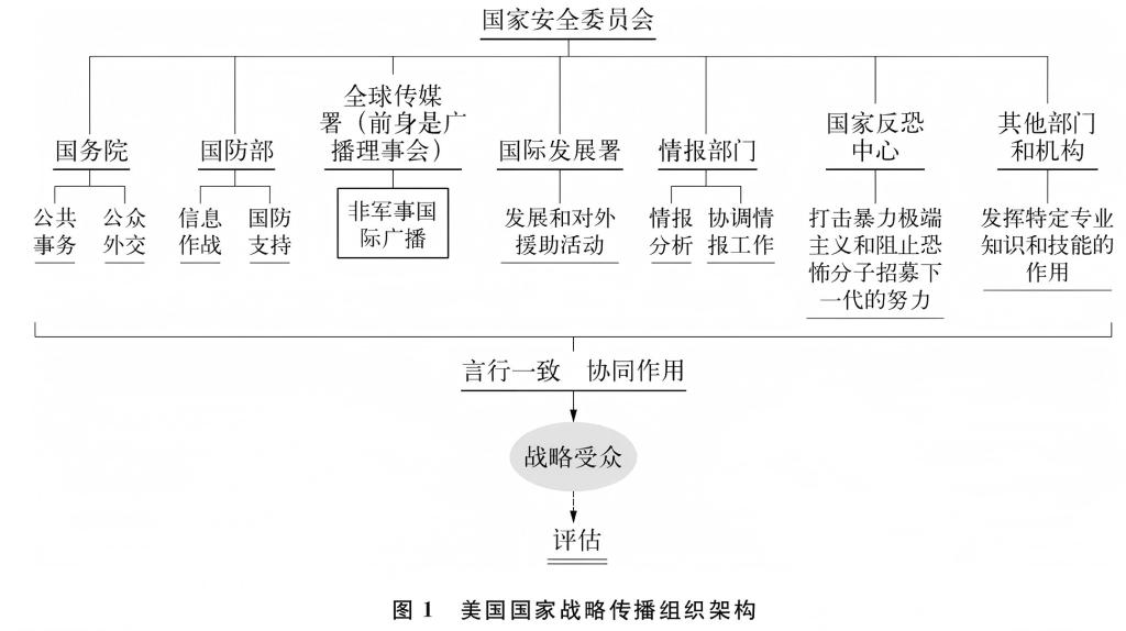 第三是组织架构的不断完善。组织架构的完善对战略传播的系统性与协同性来说尤其重要。相较其他国家来说,美国的战略传播组织架构和职能分配最为成熟,如图1所示,美国国家战略传播由国家安全委员会领导,其强调战略主体言行一致以及各部门与机构之间的协同作用,同时关注受众以对战略传播效果作出衡量与评估。北约的战略传播体系的组织架构也相对完善,其主要分为三个层级:由北大西洋理事会统一领导;军事委员会、战略司令部、北约发言人等其他组织和机构协同运行,包括战略制定与战术实施等;最终传达给受众。