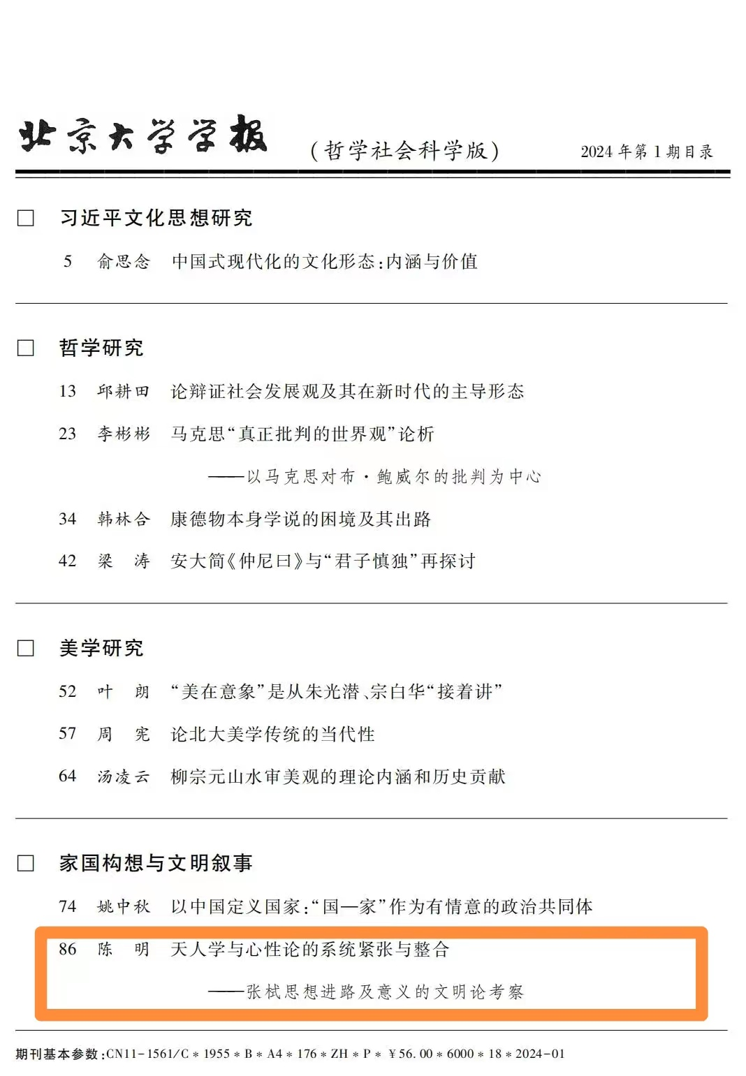 《北京大学学报(哲学社会科学版)》2024年第一期(总第341期)刊发我院陈明教授研究成果《天人学与心性论的系统紧张与整合——张栻思想进路及意义的文明论考察》,为台州学院和合文化研究院在新的一年起好步、开好局奠定了良好的科研基础。《北京大学学报(哲学社会科学版)》是由中华人民共和国教育部主管,北京大学主办的期刊,具有极高的科研指导价值,展示了人文社科研究领域的优秀成果。