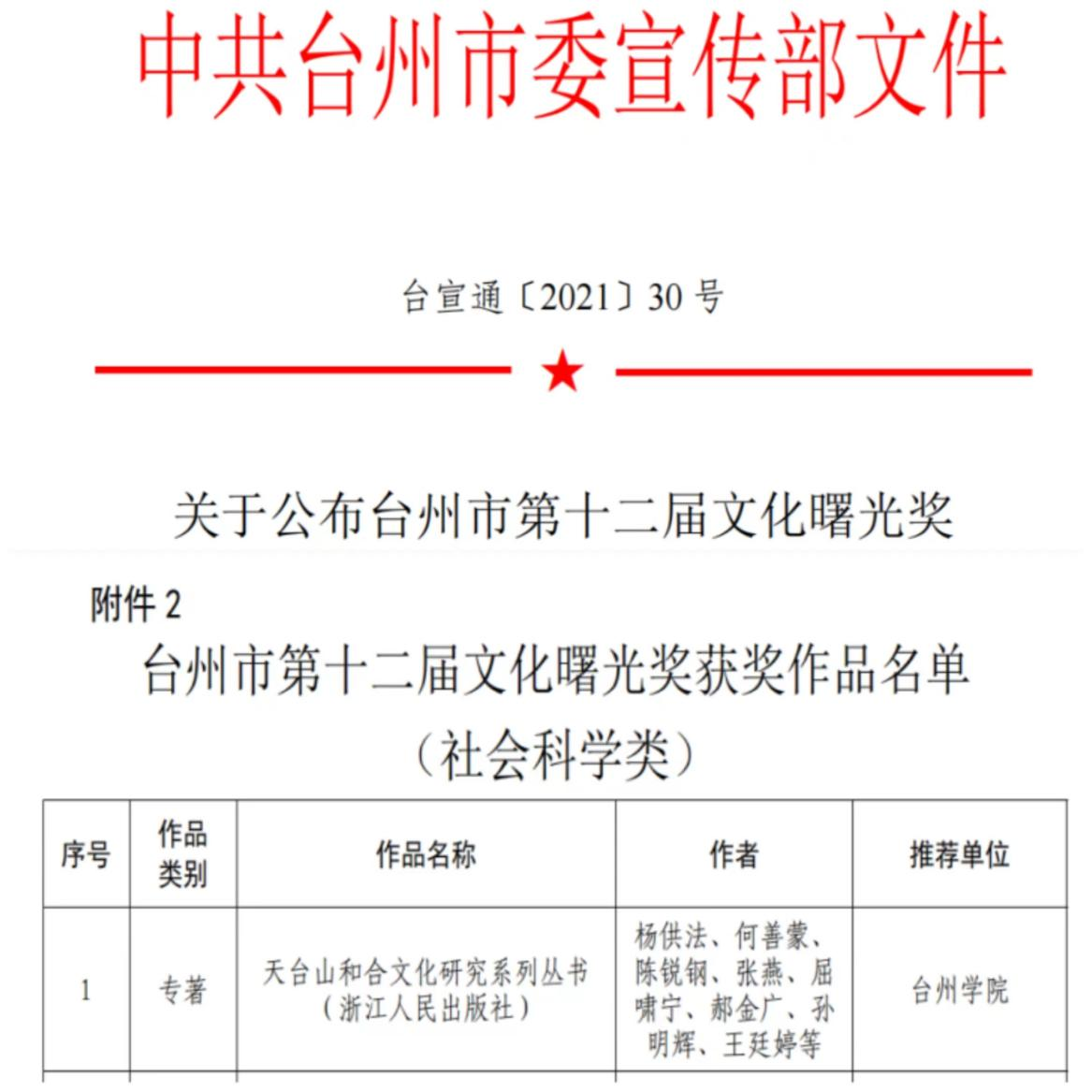 近日,中共台州市委宣传部公布台州市第十二届文化曙光奖获奖作品名单。由我院何善蒙、杨供法、 陈锐钢、张燕、屈啸宁、郝金广等老师承担撰写的天台山“和合文化研究”系列丛书(浙江省人民出版社)荣获台州市第十二届文化曙光奖(社会科学类),极大地激励了科研人员的信心,推动了学校人文社科的发展。天台山“和合文化研究”系列丛书立足台州市文化史料,内容丰富,意义深远,大力弘扬了社会主义先进文化,展现了时代风貌,对我市提高科研水平,打造理论高地作出了巨大贡献。