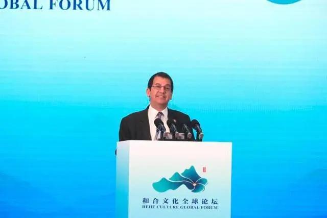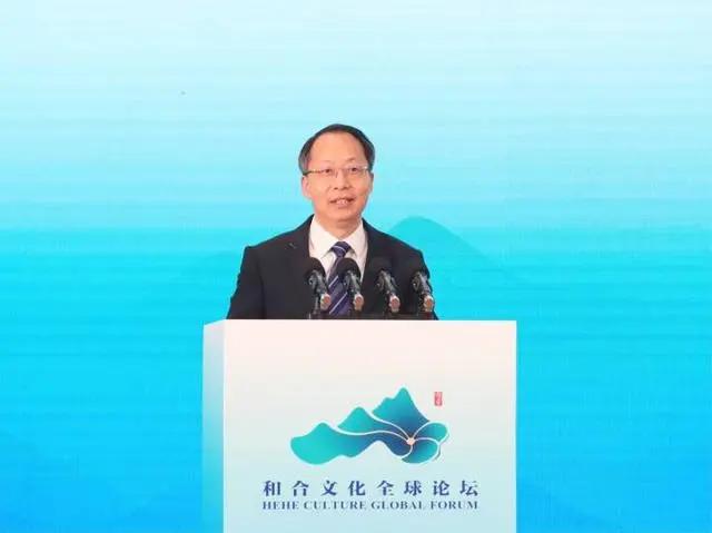 一段精彩的专题片《和合之源》播出后,论坛开幕,中国外文局局长杜占元发表视频致辞。