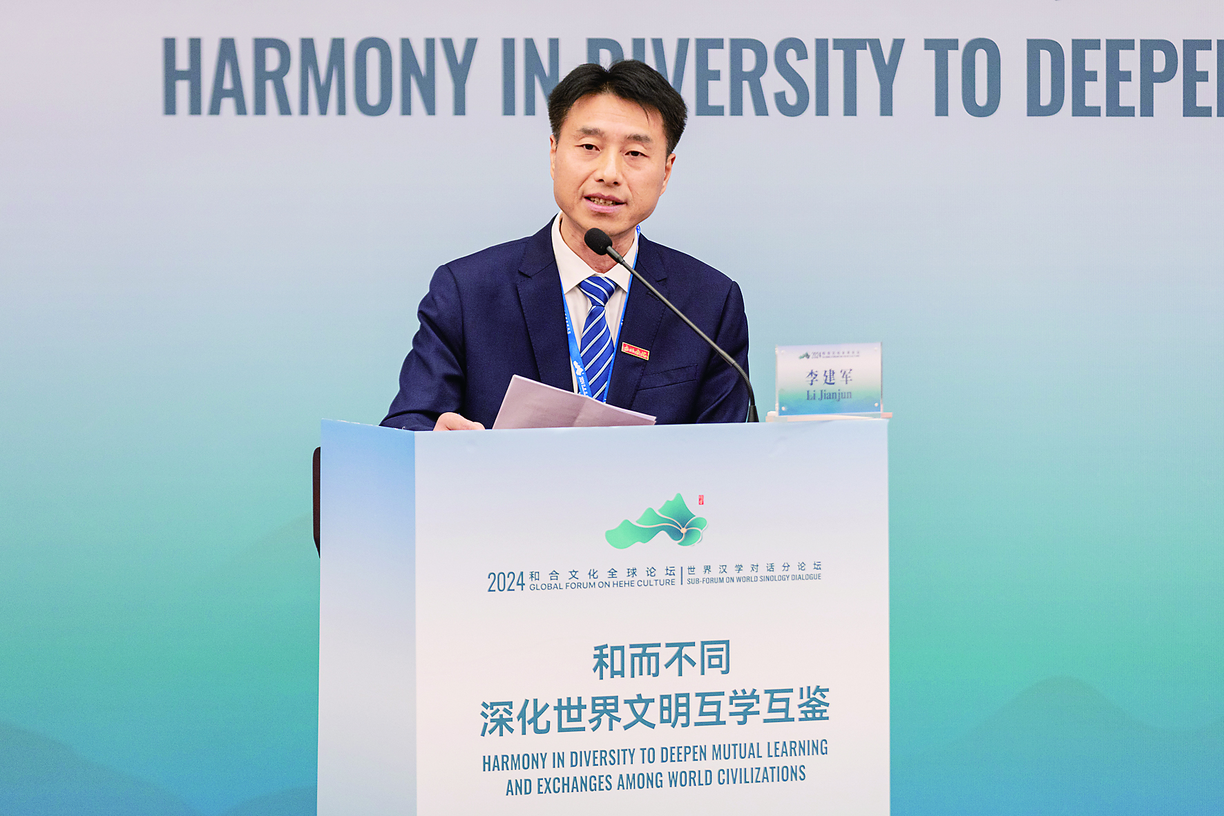 台州学院副校长李建军带来了《中西文明互鉴中的和合文化》的主旨发言。他从“和合文化是超越竞争文化的竞合文化”“和合之道是构建人类命运共同体的文化基础”“和合圣地是高扬和合理念的精神地标”三个层面带来精彩阐述,他表示作为中华文化精髓之一的和合文化,在中西文明的比较互鉴中会闪耀出更加璀璨的光芒。